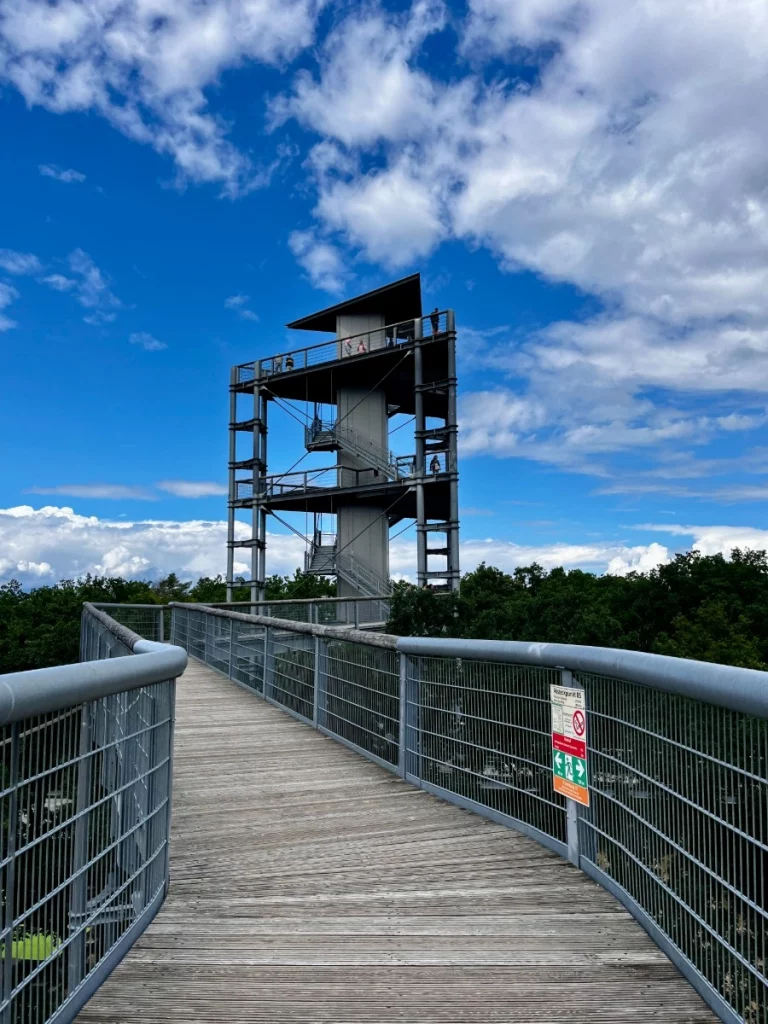 Ein besonderer Komfort-Pluspunkt für uns: Dank des Aufzugs konnte Karin ihre Knie schonen, sodass wir ganz entspannt über die Baumwipfel spazieren konnten. Wer den ultimativen Überblick sucht, sollte unbedingt den Aussichtsturm erklimmen – aus 40 Metern Höhe genießt man einen fantastischen Panoramablick, der weit über das weitläufige Gelände der Heilstätten hinausreicht.