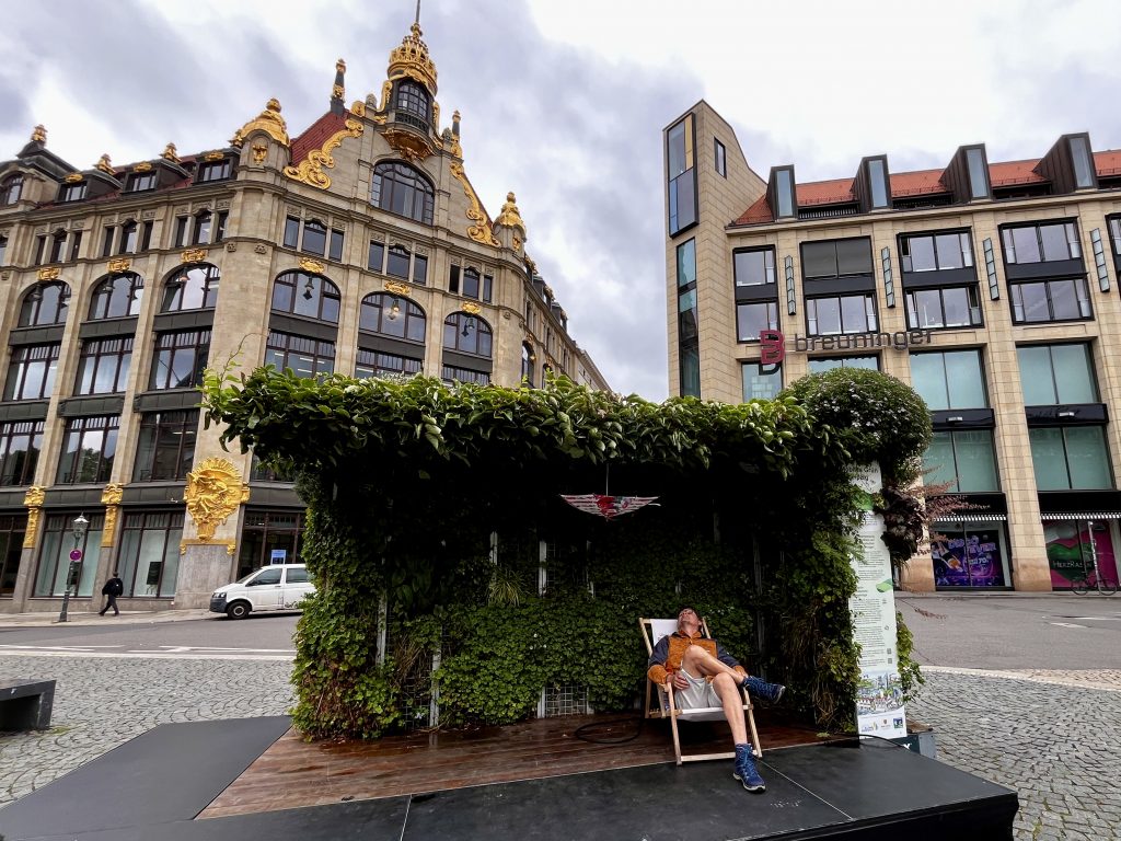Vorbei an der Alten Handelsbörse (dem ältesten Barockbau der Stadt, der wirklich mächtig was her macht) ging es zur Marktgalerie. Während ich noch Architektur bewunderte, entdeckte Ingo sein ganz persönliches Highlight: Eine grüne Oase mit Liegestuhl! Er zögerte nicht lange – Foto an, Entspannung an.