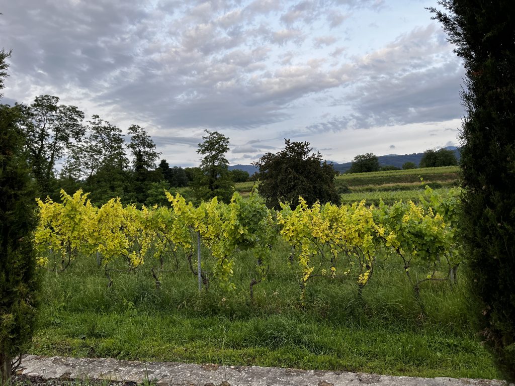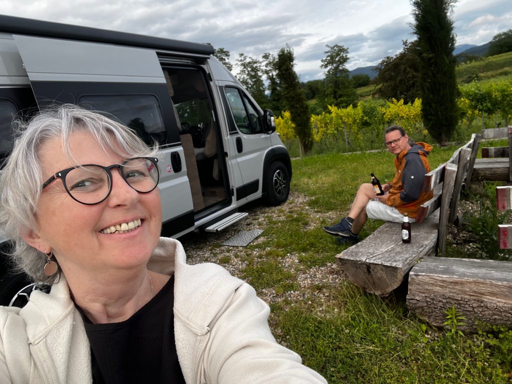 In Heitersheim angekommen, fanden wir ein Plätzchen, das man kaum als „Stellplatz“ bezeichnen kann. Wir standen beim Winzer, quasi mit den Reifen direkt im Weinberg. Die Preisverhandlung war kurz und schmerzlos: Wir sollten für die Übernachtung eine Flasche Wein kaufen (es wurden drei). Was soll ich sagen? Wir sind Menschen mit Prinzipien, also haben wir diesen harten Deal natürlich zähneknirschend (und mit einem Korkenzieher in der Hand) akzeptiert. Belohnt wurden wir mit einer dramatischen Wolkenkulisse, die zwar nach Regen aussah, uns aber trocken ließ und stattdessen einen Sonnenuntergang servierte, der den Himmel in die wildesten Farben tunkte.