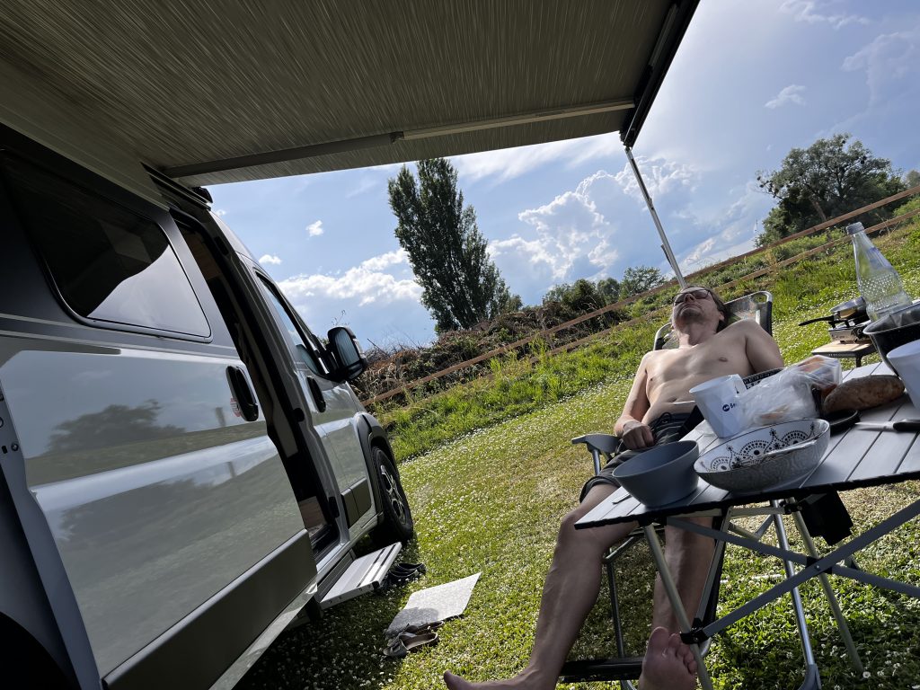 Denn als die Markise stand, stellte uns die Technik vor ein Rätsel: Wie zur Hölle geht diese Kurbelstange wieder raus? Wir zogen, wir rüttelten, wir fluchten leise. Die Stange klammerte sich am Gewinde fest, als hinge ihr Leben davon ab. Bevor wir den Ducato samt Markise im Boden versenkten, kam die Rettung in Gestalt eines erfahrenen Kastenwagen-Nachbarn.