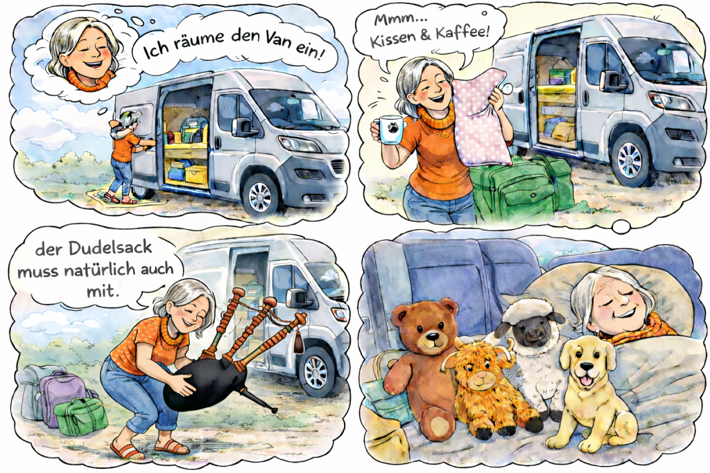 Dabei gab es eine eiserne Regel: Die Ästhetik gewinnt. Da Kätter innen in edlem Beige, Weiß und Holzoptik daherkommt, hatte Karin das farbliche Kommando. Jedes Teil – vom Teller bis zum Handtuch – musste den „Harmonie-Check“ bestehen. Wer nicht ins Farbschema passte, flog raus. Wildes Camping? Gerne. Wilder Farbmix? Niemals!